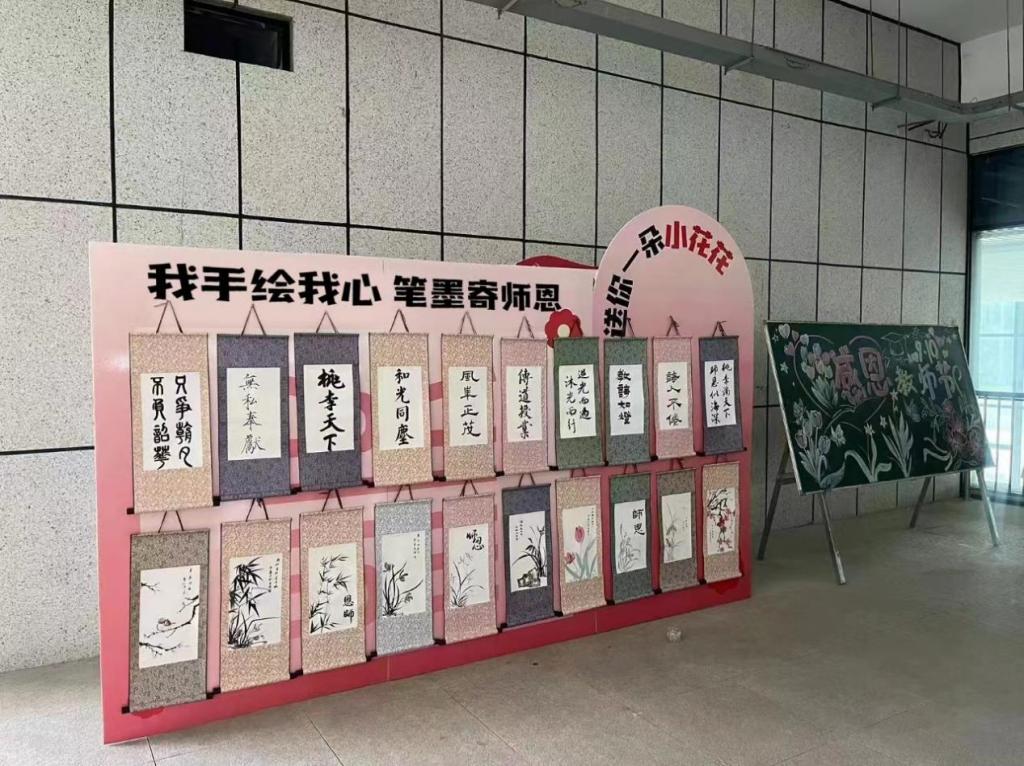 展览以感恩师恩、尊师重教为主题,共展出书法作品十件,国画作品十件。学生们运用精湛的笔墨技巧和独特的构思,充分发挥自己的想象力,以书言志、以画寄情,充分展现了对老师们的深深敬意和感激之情!无论是国画的细腻笔触,软笔书法的流畅线条,还是黑板报的丰富内容,每一笔每一划都充满了对老师崇高的敬意和真挚的祝福。此次展览,不仅向教师们致以最诚挚的感谢,更是师生情感交流的桥梁,知识传承的纽带。