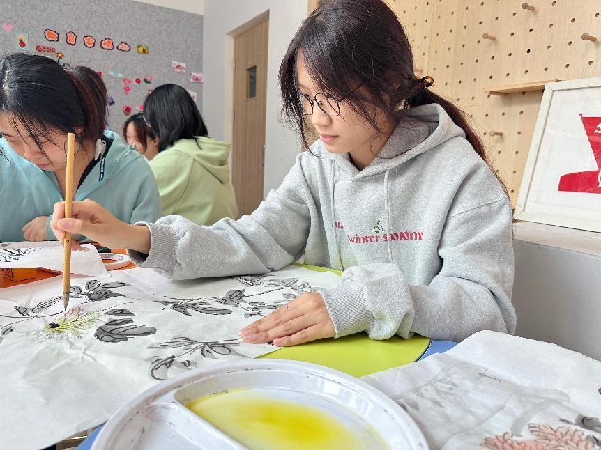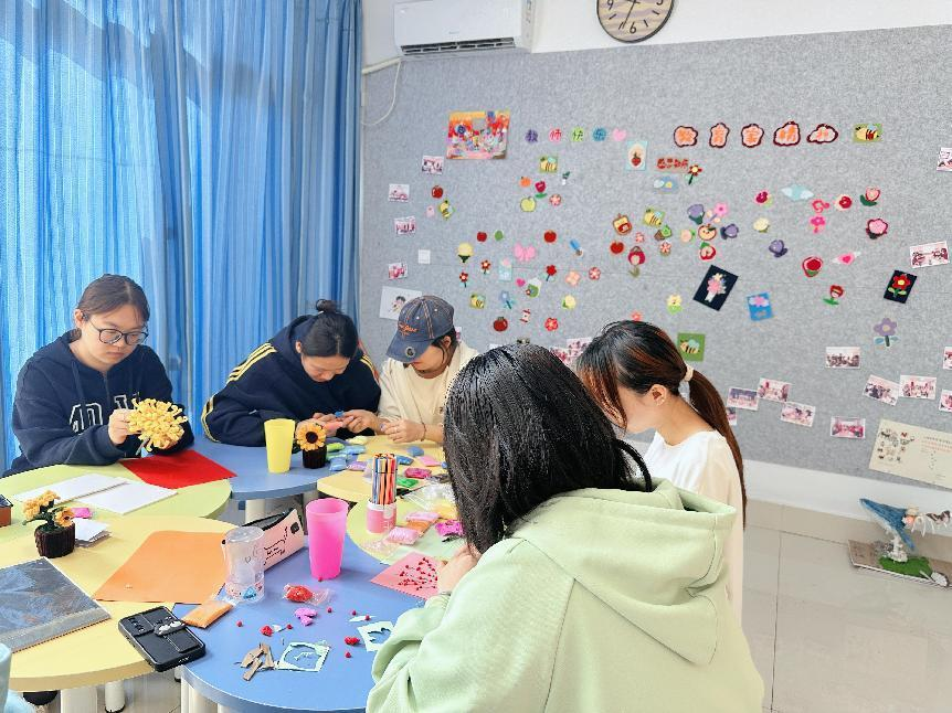 活动中,同学们制作生动形象的茱萸,了解了“遍插茱萸”这一传统习俗的意义。随后,手工卡纸制作菊花的活动让现场充满欢声笑语,大家纷纷展示自己的创意与想象。在画菊花的环节中,同学们领略了中国国画的魅力,专注挥动画笔,创作出充满情谊的作品。最后,大家在信纸上写下对长辈与朋友的寄语,表达对他们的关心与祝福,并将这些信纸投递到一站式学生社区心语信箱中,期待在重阳节当天传递温暖。