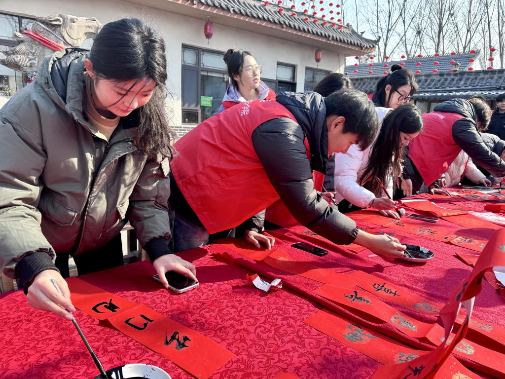 活动伊始,滕州市九龙湾乡村振兴示范区与yl6809永利进行了“大学生社会实践基地“揭牌仪式,志愿者们参观了西岗镇九龙湾滑雪场、北赵景村融合区、水上乐园等,体验了乡村振兴建设的丰硕成果。随后,志愿者们挽袖执笔,饱蘸浓墨,随着笔锋的转动,一副副苍劲有力的新春对联、“福”字跃然纸上,志愿者们将心底的美好祝愿化作寓意平安和谐、吉祥如意的书法作品,书写出辞旧迎新的美好愿景。社区居民们围在桌旁,一边欣赏着书法创作,一边挑选着自己心仪的对联和福字,脸上洋溢着幸福的笑容。