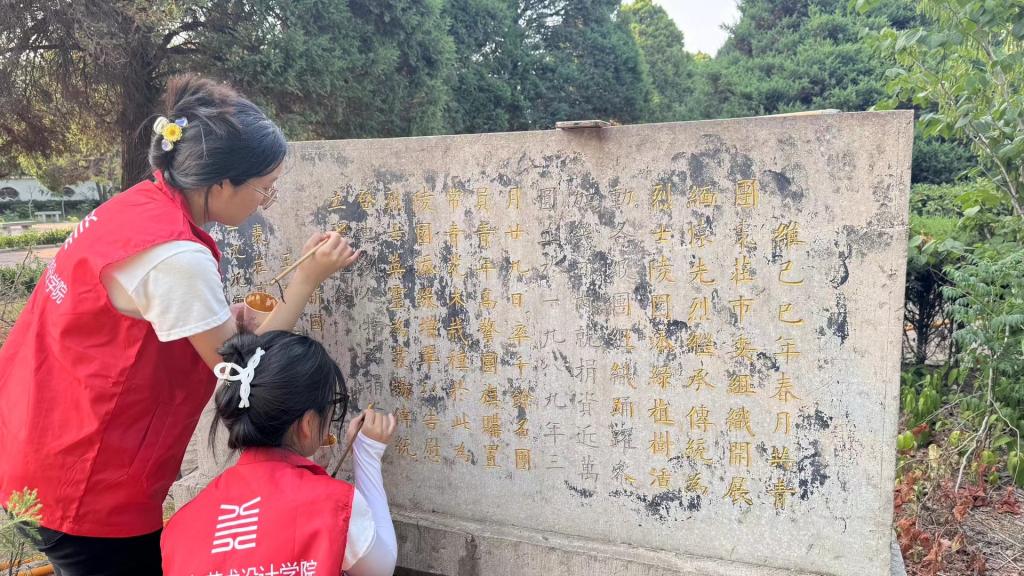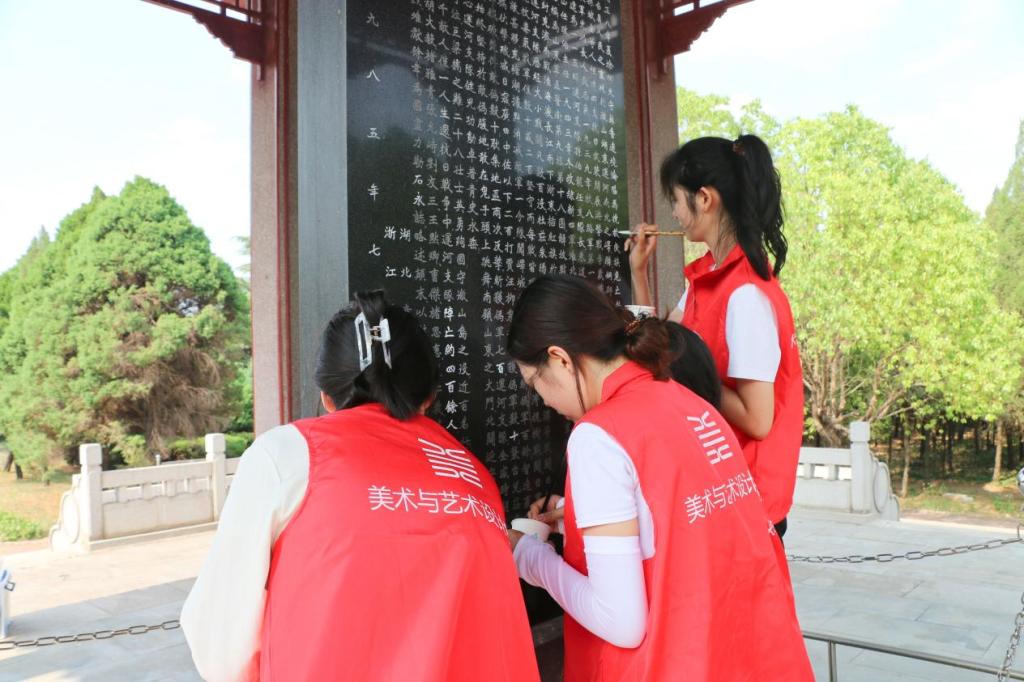 本次活动包括缅怀先烈、重温入党誓词、聆听革命故事、手绘英模、碑文描摹五部分。在烈士陵园纪念碑前,全体党员肃立、默哀、追思,表达对英雄先烈的深切缅怀和崇高敬意。随后,全体党员面向党旗,高举右拳重温了入党誓词,在铿锵有力的誓词中坚定理想信念、砥砺初心使命。在怀烈亭中,烈士陵园王主任讲述了“青年战斗英雄”安保全的故事,党员们深入了解到他的英雄事迹,并清扫了亭中的落叶、杂草、树枝等。在手绘英模环节,美术学专业党员志愿者发挥专业优势,用手中的画笔还原烈士的样貌,再现安保全、马立训等英雄故事,传承红色基因。书法学专业党员志愿者开展碑文修复志愿服务活动,擦去纪念碑上的灰尘,用毛笔蘸金箔漆,一笔一画为枣庄革命烈士陵园碑文进行描金,纪念碑上逐渐暗淡的文字再次熠熠生辉。本次活动共绘制14件作品并赠与枣庄革命烈士陵园,完成三处碑文修复。