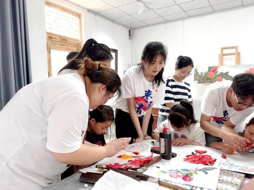“青绘·艺行”志愿者服务队于枣庄石榴书画院,依托国家级志愿宣讲项目——“中国历代绘画大系”,开展了以石榴为主题的绘画宣讲活动。志愿者为张庄村留守儿童宣讲了中国绘画历史及绘画手法、古画中石榴元素的创作手法等知识。随后,志愿者带领小朋友开展了国画、创意小手工、书法、漆扇diy课堂,带领小朋友们参观了“榴光溢彩满枝头,共画石榴促发展”石榴主题书画展,共展出60余件作品,其中,历代古画复刻作品20件、30件手工作品、10件书法作品,让小朋友们在了解传统文化的同时,也能感受到石榴所承载的美好寓意。