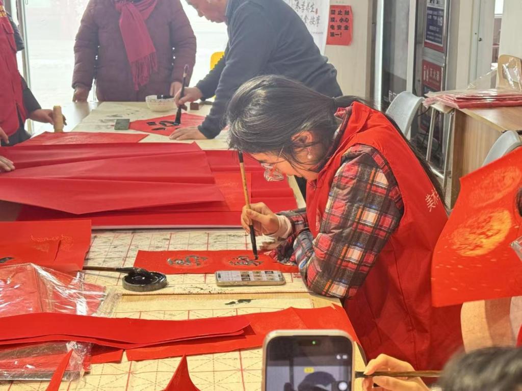 活动现场,志愿者备好笔墨纸砚、铺展红纸,书写寓意吉祥的春联与“福”字,寄寓家国安康、生活幸福的美好祝愿。现场创作之余,志愿者们还热情邀请社区居民参与传统书法创作,耐心指导社区居民握笔、运笔技巧,让其亲身感受汉字与书法艺术的独特魅力。书写完成后,志愿者们走访社区,将满载心意的春联与“福”字送到居民手中,在亲切的交流中传递新春温暖与关怀。活动尾声,志愿者们细心整理打扫场地,并与社区工作人员、居民手持春联合影留念,定格这场兼具文化气息与社区温情的美好瞬间。
