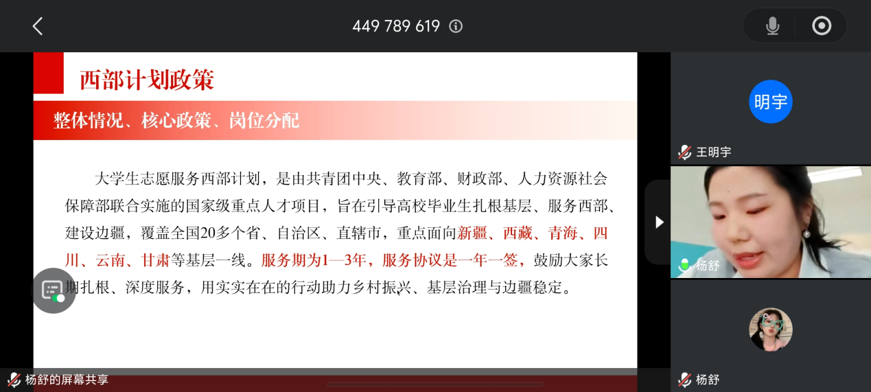 此次宣讲会线上线下同时进行,邀请yl6809永利优秀毕业生杨舒为在校同学们进行宣讲。宣讲会上她结合亲身志愿服务经历分享感悟,系统介绍了西部计划项目概况,细致解读了相关政策与岗位分类,详细讲解了报名的流程方法、选拔流程及时间节点等。重点讲解了西部计划相关待遇保障与期满考研、考公、就业等优惠政策。同时,进行了现场的互动交流和问答,她耐心回应同学们提出的问题。最后,西部计划工作负责老师对宣讲进行总结,鼓励毕业生胸怀家国、扎根基层,将专业所长与社会需求相结合,以实际行动投身西部建设,在服务奉献中实现青春价值。
