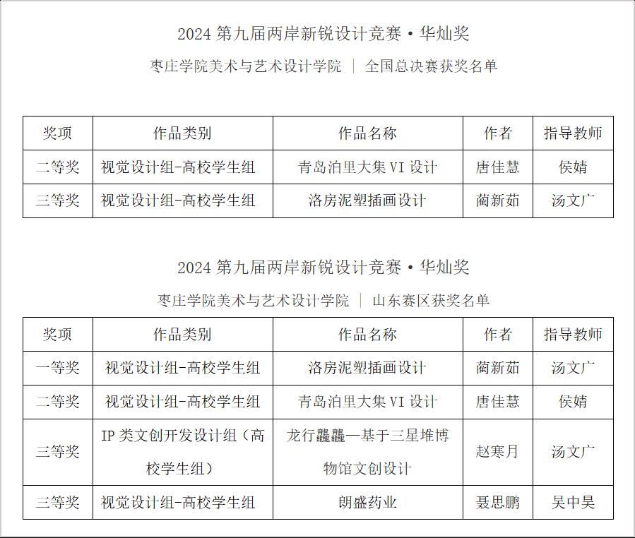 近日,第九届两岸新锐设计竞赛·华灿奖获奖名单公布,yl6809永利在本次大赛全国总赛中分别获得二等奖、三等奖各1项;在山东省赛区中获得一等奖1项、二等奖1项、三等奖2项。yl6809永利积极践行“思政引领、以赛促学、以赛促教”教学改革,通过进行有组织的学科竞赛来提升学生的综合实践能力、主动创新能力和团队协作能力。
