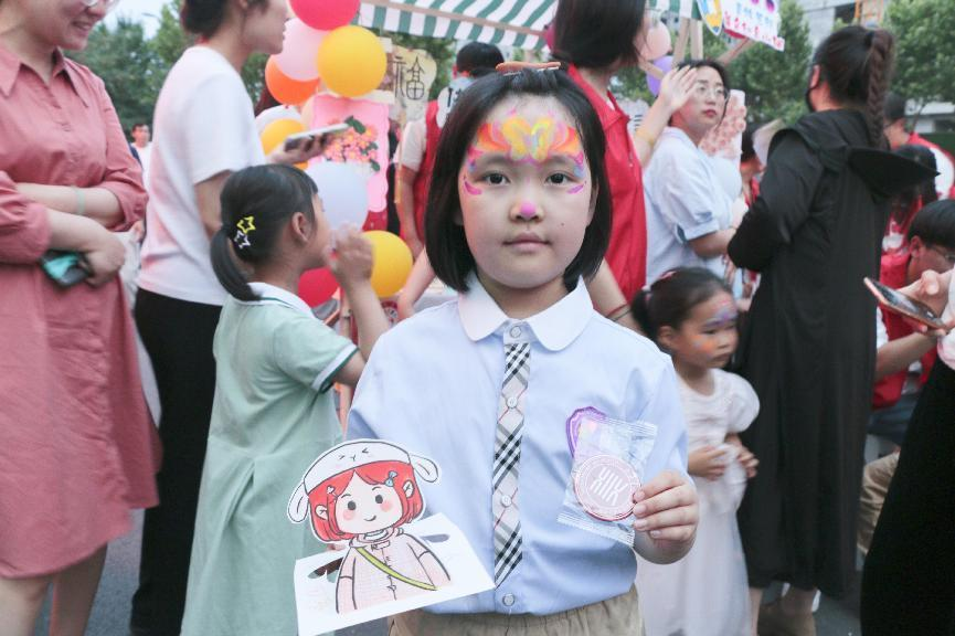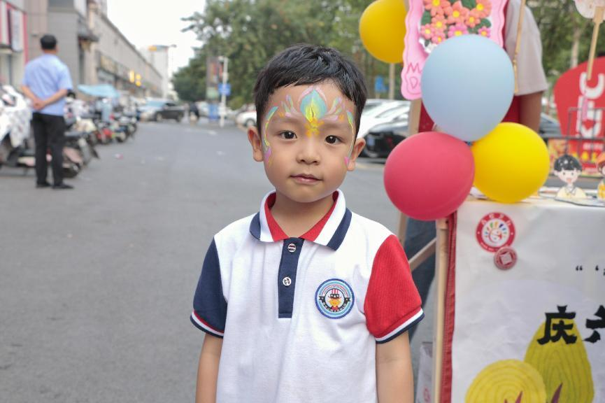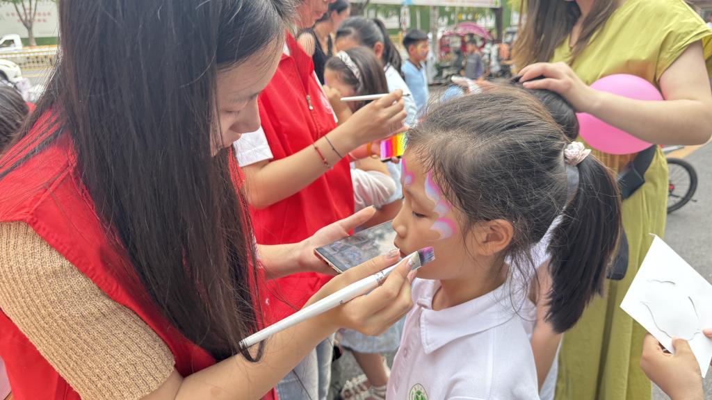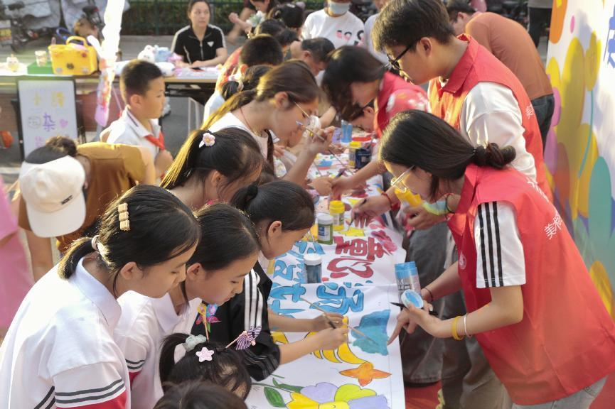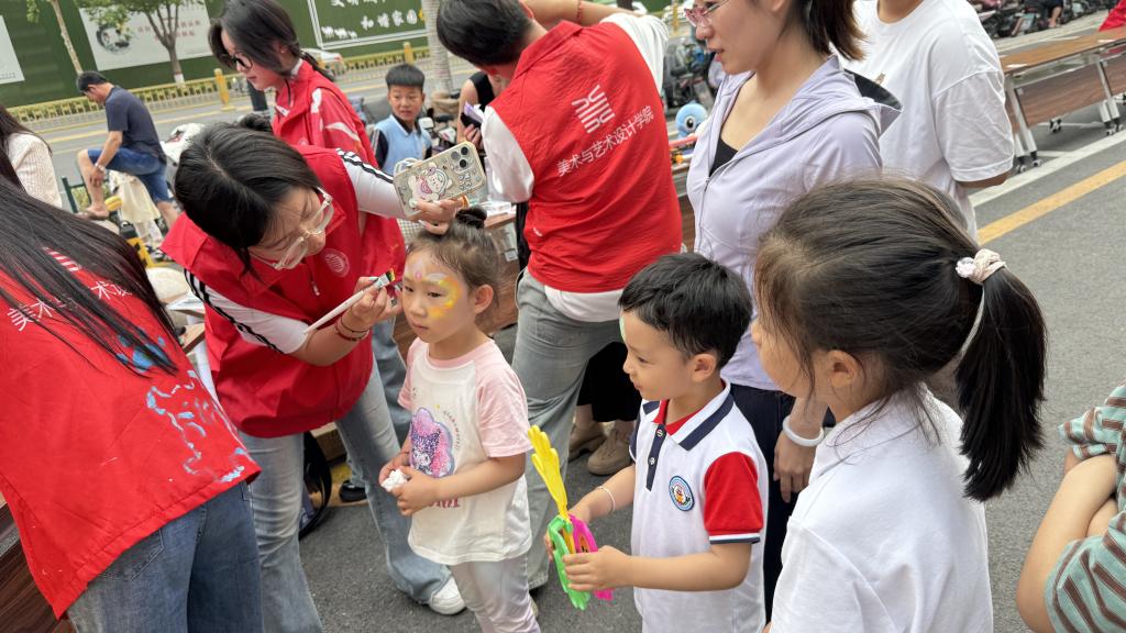 活动中,志愿者协助小朋友布置摊位,为摊位设计独特的海报和标语。小朋友们扮演小摊主的角色,将自己的玩具、书籍、手工艺品进行售卖。青绘艺行美育创意小铺邀请小朋友一起进行创意体验。志愿者根据小朋友的面部特征,用植物颜料,为每个小朋友绘制了独一无二的面部彩绘。小朋友们兴奋地与家长夸赞自己脸上的彩绘,并拍照留念。随后,在纳斯卡巨画的挑战中,小朋友们在志愿者的带领下,相互交流、分工合作,调配颜料、挥毫如雨,尽情发挥独特的创造力和艺术才能,用手中的画笔在巨大的绘画布上挥洒出绚丽的色彩,共同绘制出一副充满活力的画卷。最后,志愿者们带领小朋友一起进行非遗漆扇制作,小朋友们根据自己的喜好调配颜色,在团扇的沉浮中,漆色便附着到了扇面上,一幅幅精美的漆扇作品便呈现在眼前。
