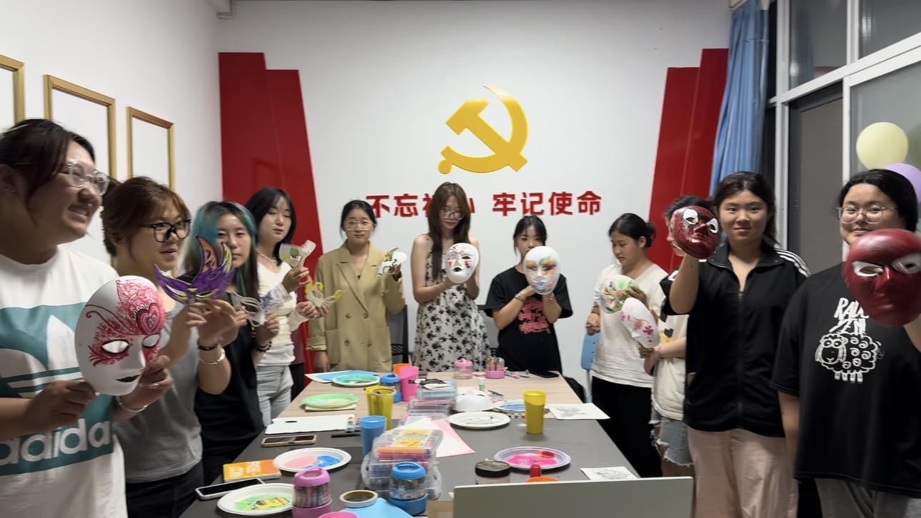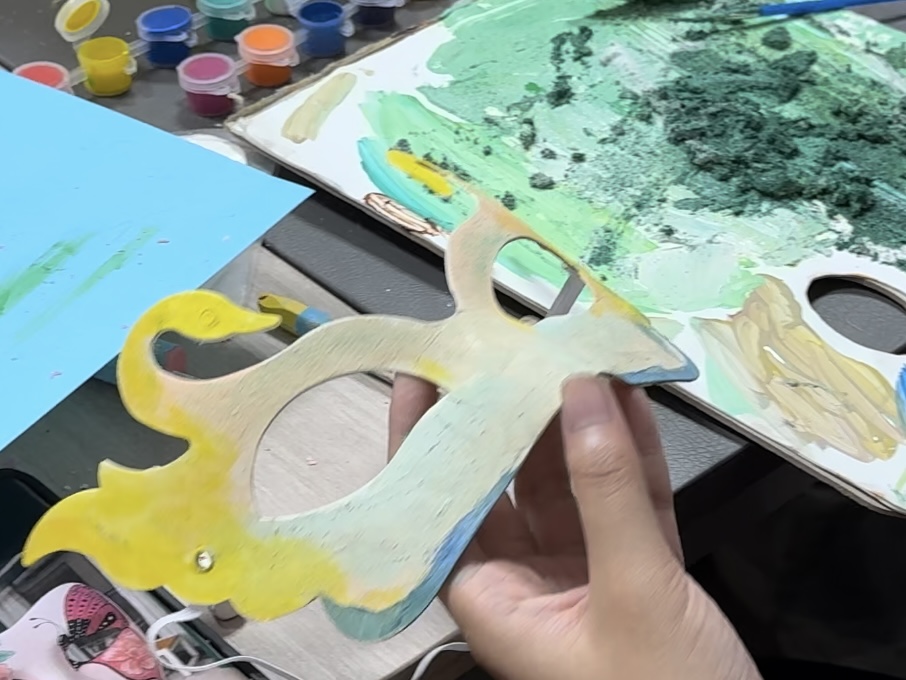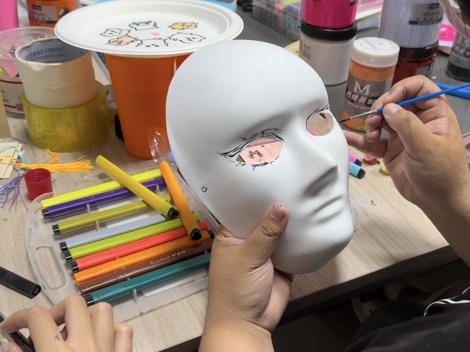 E言艺语工作室主持人高翠萍老师带领学生欣赏了艺术作品,并鼓励他们参与镜子碎片拼贴画、肌理画、纸盘画、面具画的自由创作。在创作过程中,学生们拿起画笔,自由地在画布上挥洒颜料,将内心的想法和情感通过色彩和线条表达出来。每一笔每一画都是他们内心深处意识的直观体现,学生们完全沉浸在与自我对话的艺术体验中。通过绘画和动手制作,缓解了内心面对就业和毕业产生的焦虑和紧张情绪,这种艺术美育疗愈的过程不仅让学生更加了解自己,并提供了有效的指导和舒缓压力的方法途径,引导学生学会自我疗愈。