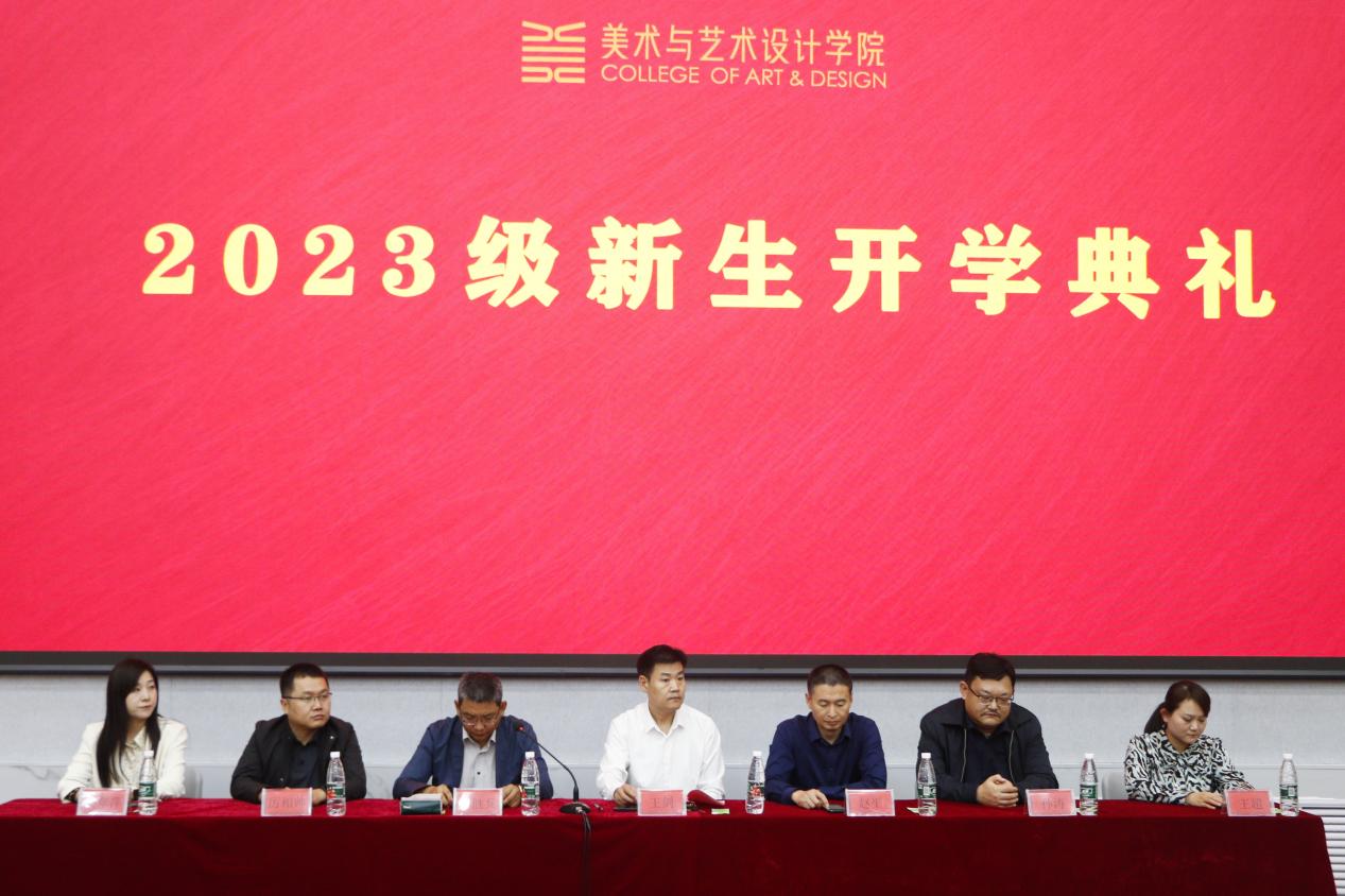 随着庄严雄壮的国歌响起,2023级新生开学典礼正式拉开帷幕。首先,在校生代表、各教研室主任分别发言,向同学们表示热烈的祝贺和诚挚的欢迎。随后,各位领导和教师代表共同为新生代表授戴院徽。新生代表发言,表达对未来学习生活的规划和希望。最后,学院党总支书记王剑在典礼上致辞,并对2023级全体新同学提出四点希望以共勉:一在家国情怀中传承美,二在崇德尚艺中认识美,三在服务社会中追求美,四在守正创新中创造美。