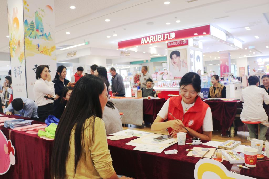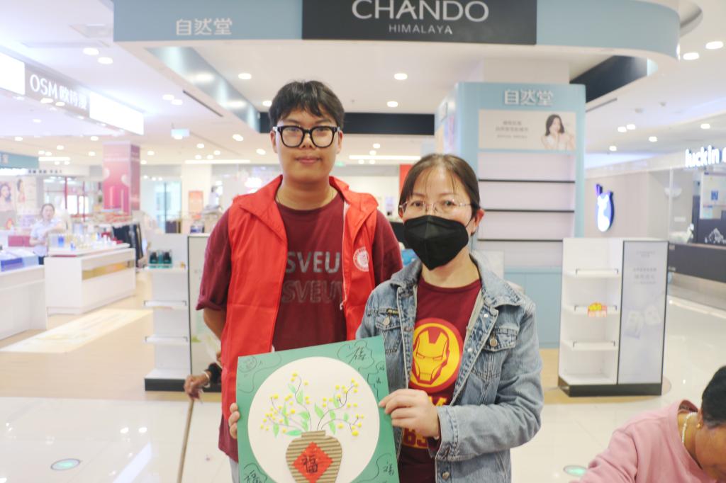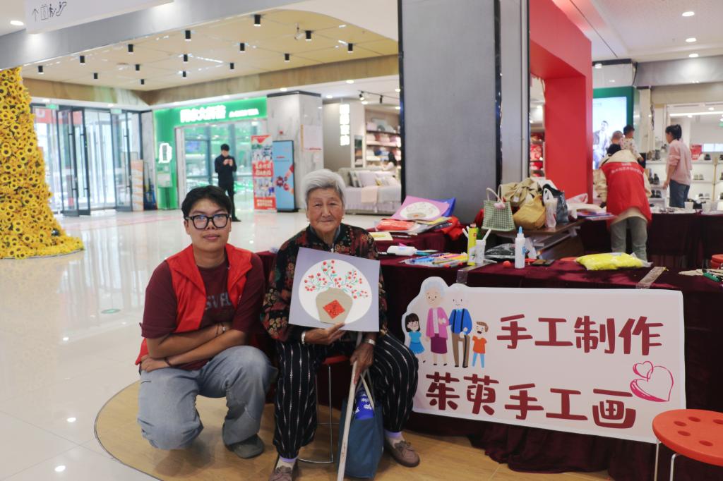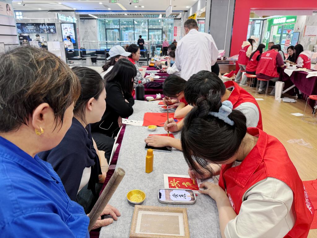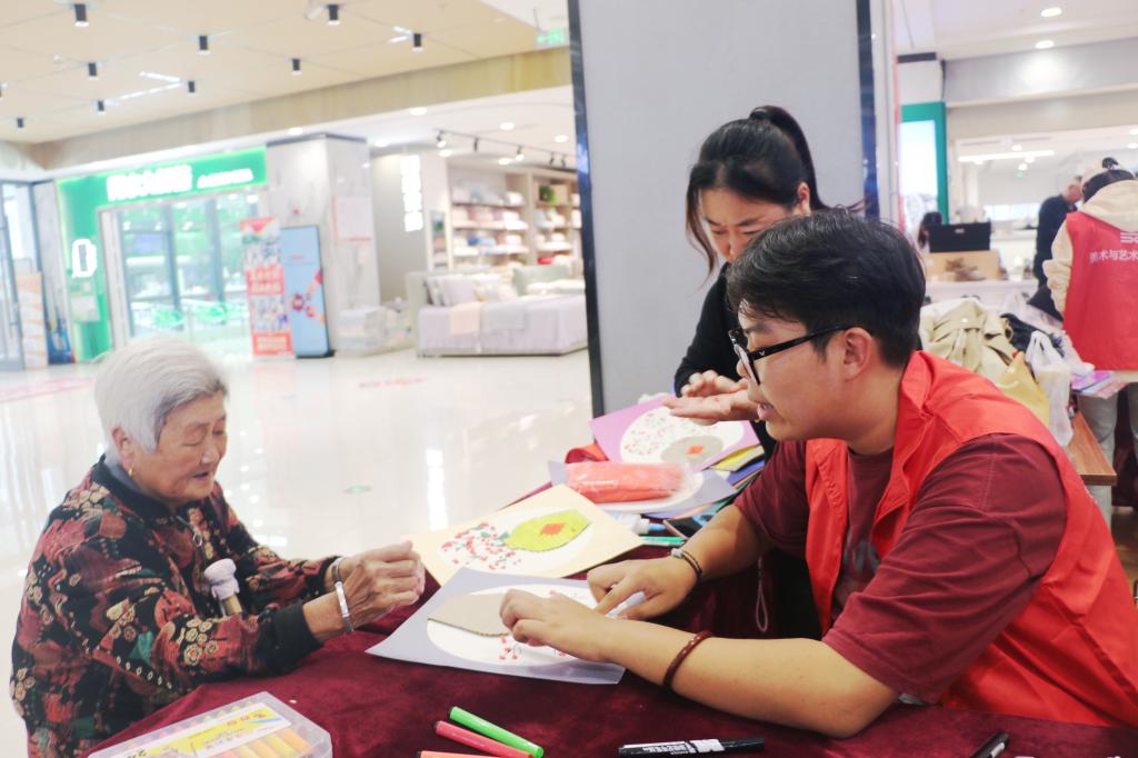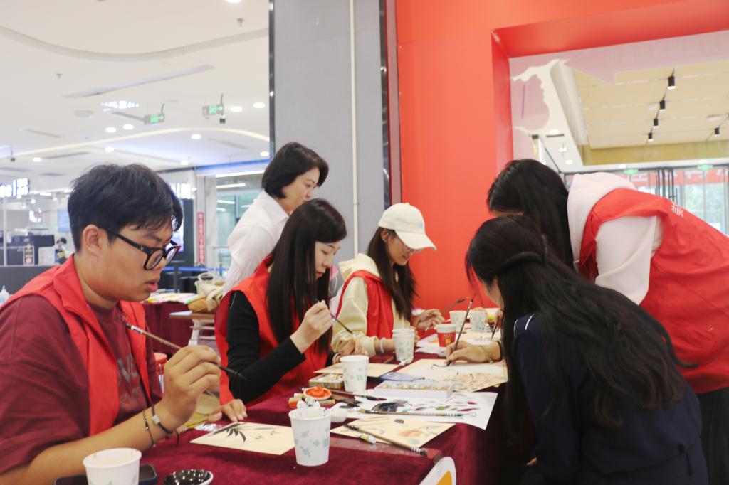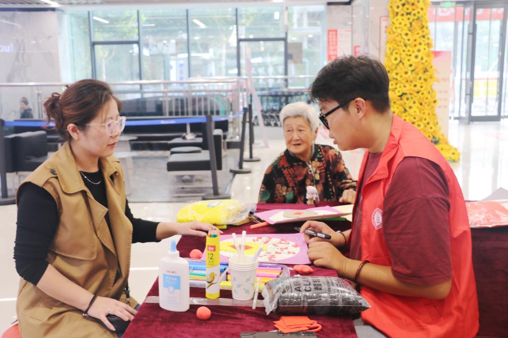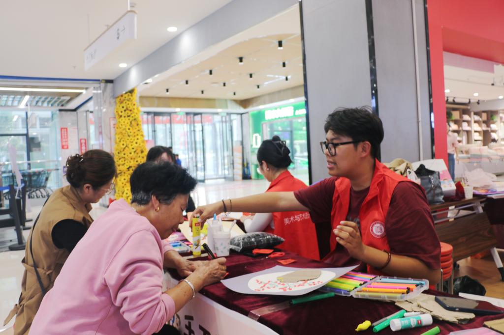 活动现场热闹非凡,“书情画意”社区国画课堂、书法艺术交流以及手工制作-茱萸手工画以其独特的魅力吸引了众多社区居民的热情参与。美术学专业的志愿者耐心细致地讲解国画的基本技巧,从笔墨纸砚的选择到线条的运用,再到色彩的搭配,每一步都讲解得细致入微。书法学专业的志愿者与社区书法爱好者们共聚一堂,畅谈书法艺术之美。民间手工艺协会的志愿者现场指导社区居民如何制作手工画,社区居民用各种颜色和形状的纸片,拼贴出一幅幅生动的作品。志愿者共服务社区老人居民60多人,完成作品100余件,这些作品不仅寄托了他们对健康长寿的美好祝愿,更展现了青年大学生对文化的热爱和传承。