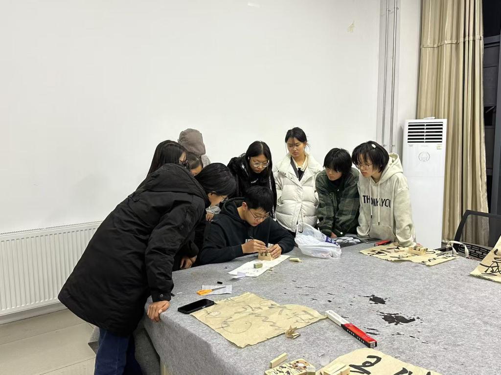 课堂上,文萃印社负责人从篆刻艺术的起源、发展历程讲起,详细介绍了篆刻的基本工具、材料以及雕刻技法。随后,其负责人进行了现场演示,从印稿设计到印章刻制,每一个步骤都精准到位、一丝不苟,让同学们直观感受到了篆刻艺术的独特魅力。在实践环节,同学们热情高涨,纷纷拿起刻刀尝试创作,社团成员在旁耐心指导,及时纠正同学们的操作误区。活动结束后,同学们纷纷表示此次篆刻活动深刻感受到了中华传统文化的博大精深。