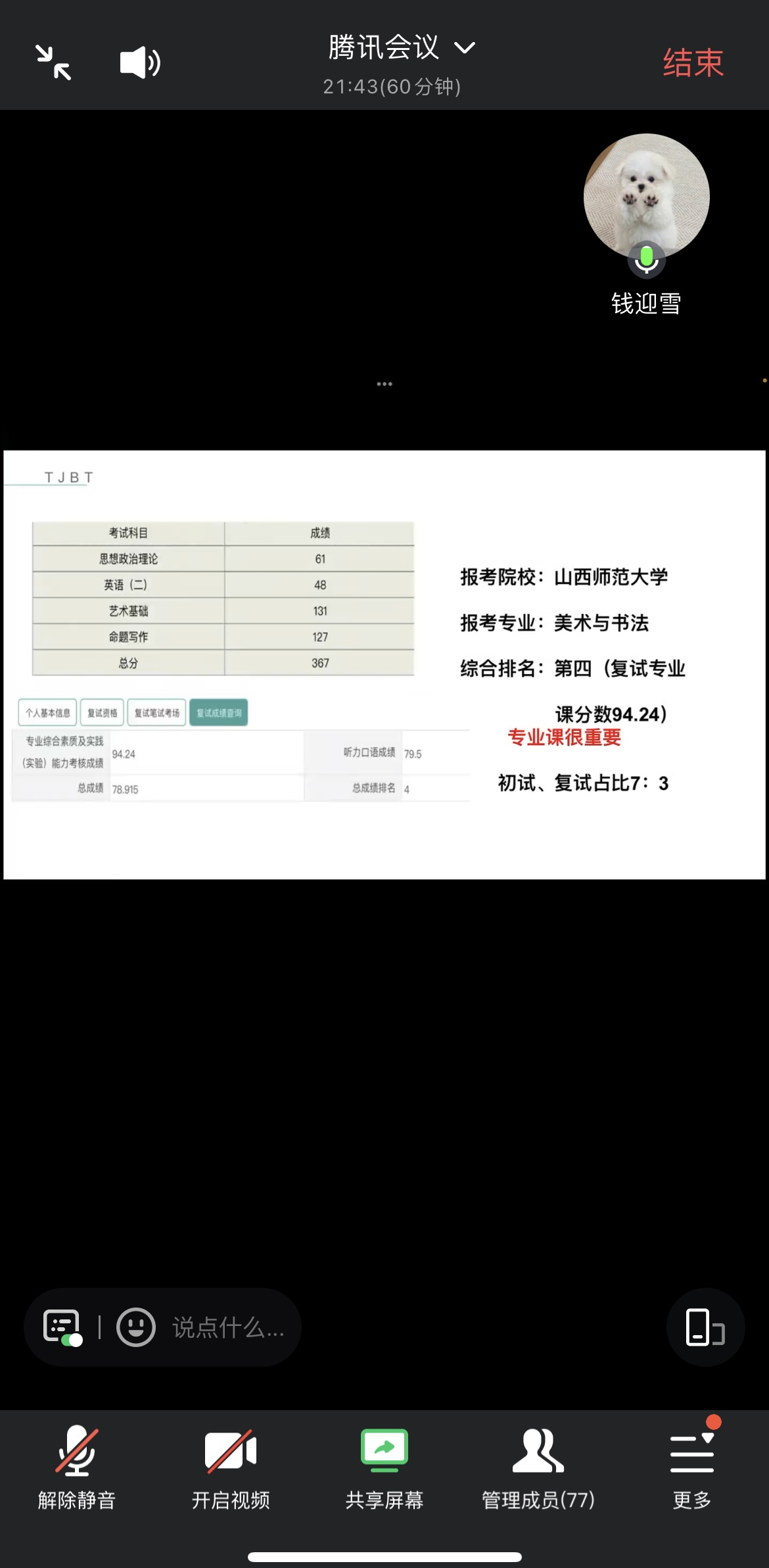 为加强就业指导,发挥优秀毕业生作用,522日学院举办了就业引航系列活动之考研经验交流会。此次交流会邀请了优秀毕业生钱迎雪进行分享,2021级各专业共计160多名学生在线参与。