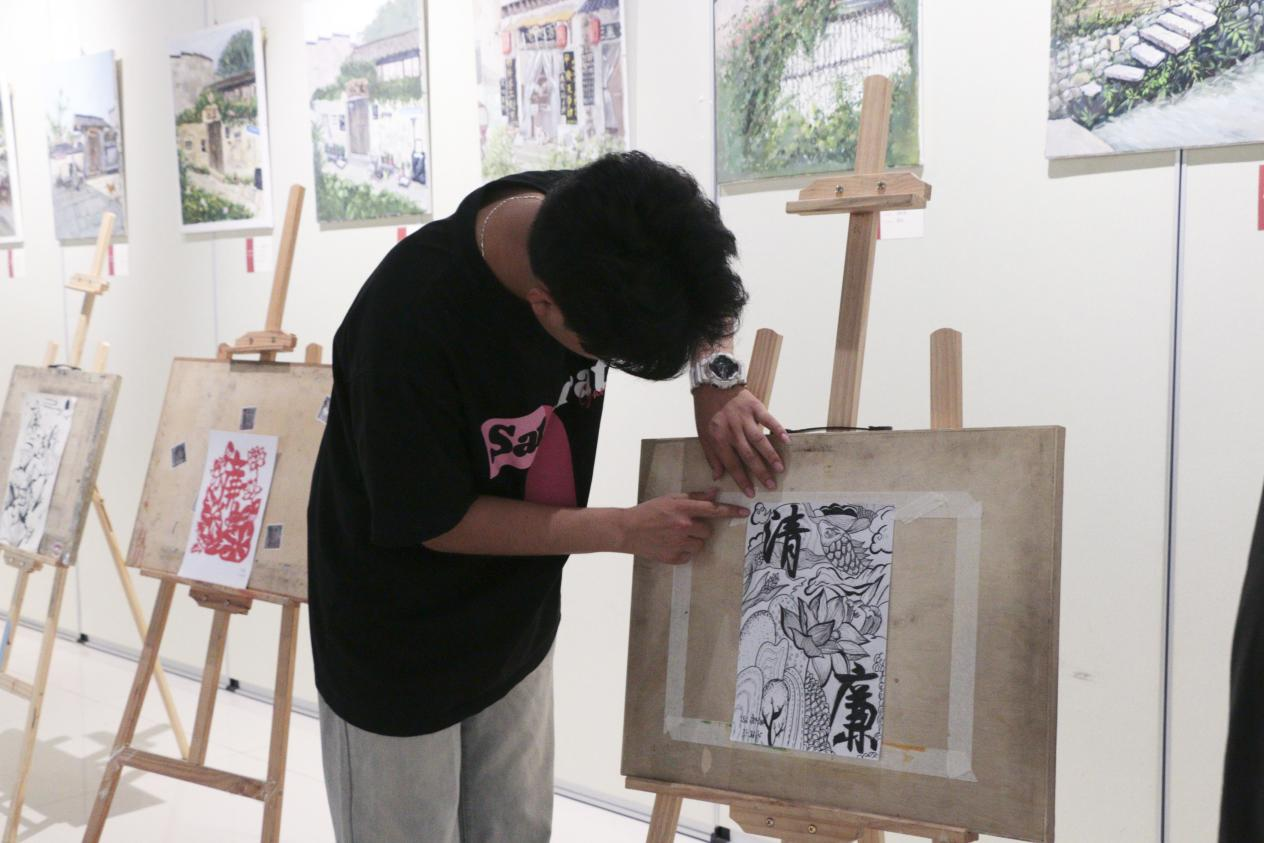 此次书画作品展活动,共征集到40余幅作品。这些作品以红色文化、革命精神、廉洁文化为主题,风格多样、形式丰富,涵盖了绘画、海报、书法、复刻名画等多种艺术形式,以饱满的热情和精湛的技艺,把对祖国繁荣昌盛的美好祝福描绘成精彩画卷。展览活动现场,学生们在讲解员的讲解中了解到每幅作品的创作背景、艺术特色以及所蕴含的理念。前来观展的学生们,或驻足观看,或相互交流,或拍照留念。通过参观展览,学生们更加深入地了解了党的历史,增强了党性教育和爱国主义情怀。