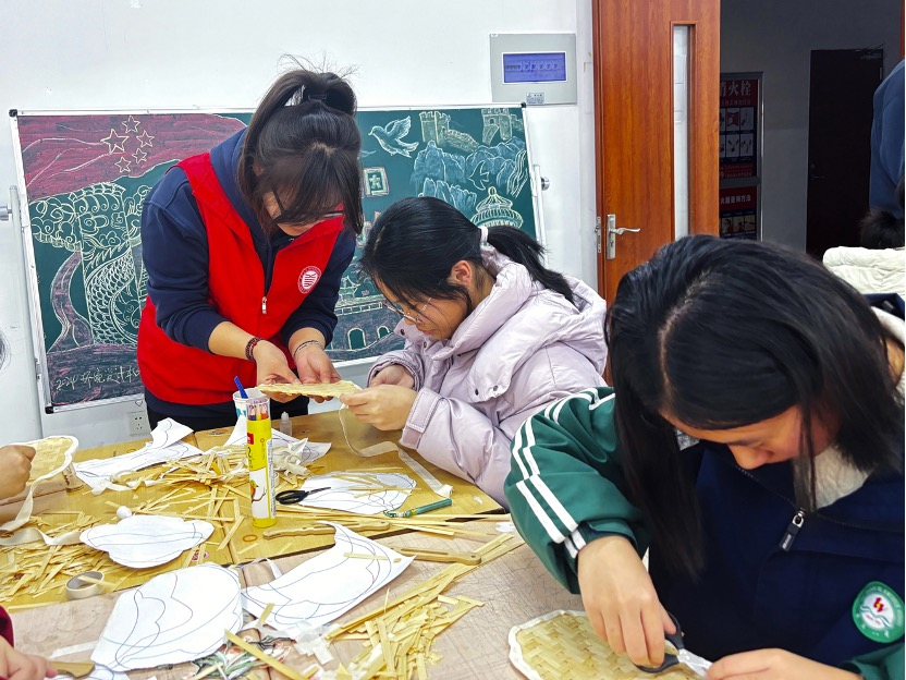 此次美育研学共包括艺术疗愈曼陀罗绘画和非遗竹编团扇两个部分。艺术疗愈曼陀罗绘画是一种舒缓学习压力,通过艺术绘画的方式释放压力的方法,通过破冰游戏、感知自我、涂色等环节进行。非遗竹编团扇中,向学生们讲解了非遗竹编的文化历史和艺术价值,展示了竹编画的制作技艺,带领同学们使用竹条灵活穿梭,编织出一个个精美的团扇。此次活动共创作竹编团扇72件。